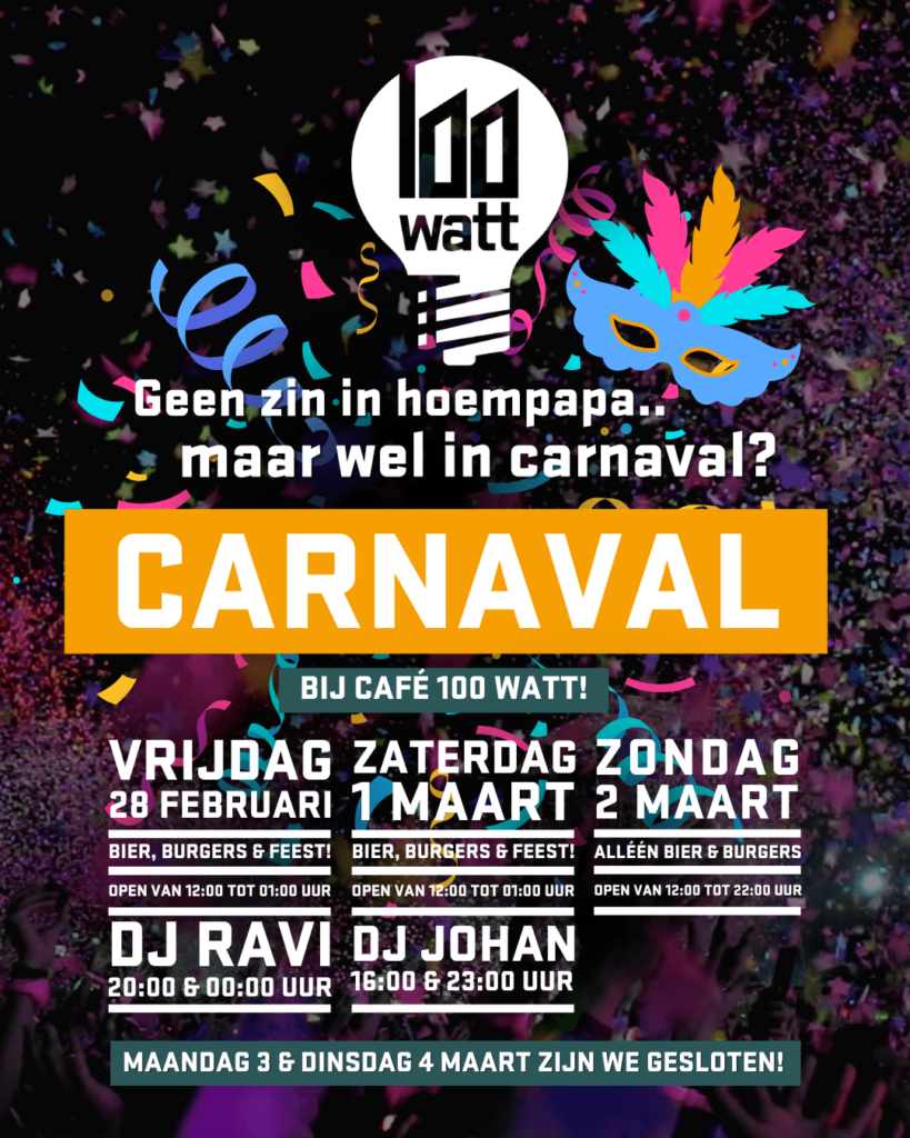 Of je nu de hele dag in feeststemming bent of juist op zoek bent naar een ontspannen carnavalservaring, bij Café 100 Watt vind je het allebei. Kom langs en beleef een topcarnaval op jouw manier!