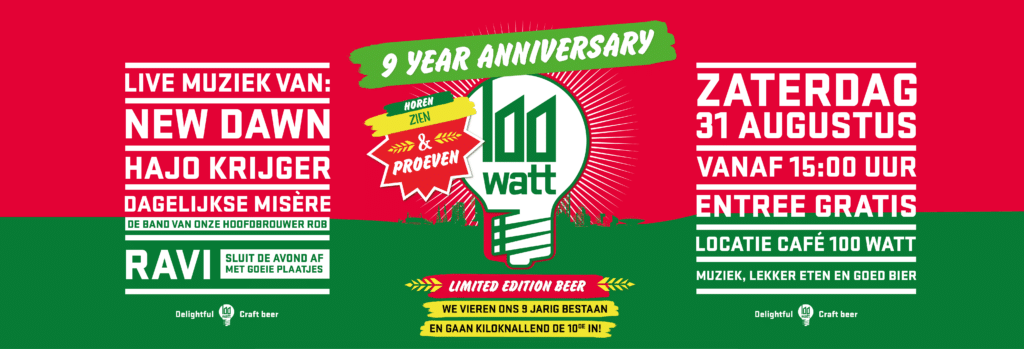 Dit jaar bestaat 100 Watt alweer 9 jaar en dit willen we niet zomaar voorbij laten gaan. Op zaterdag 31 augustus vieren we onze 9 Year Anniversary met een feest bij café 100 Watt. Een middag en avond gevuld met livemuziek van verschillende artiesten. Vanaf 15:00 uur start het feest en kun je komen proosten met bieren uit onze barrel aged bar of met ons exclusieve 9YR Anniversary bier! Daarnaast is onze nieuwe keuken ook helemaal in gebruik en verzorgen we de lekkerste burgers en snacks.